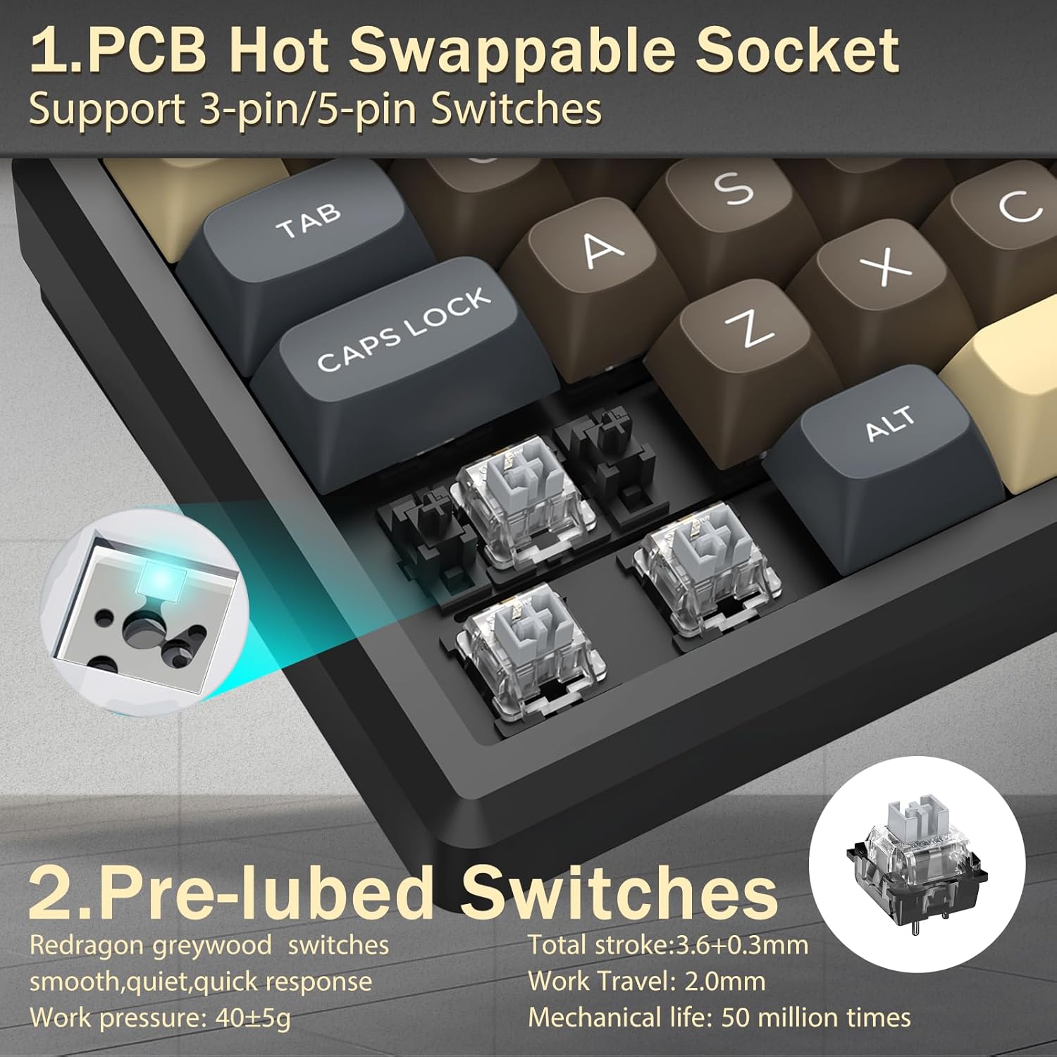 Хар K727 60% Утасгүй механик тоглоомын гар нь механик унтраалгаар дэмжигдсэн мэдрэмжтэй бичих туршлагыг санал болгодог. Компакт зохион байгуулалт нь оновчтой тохиргоог илүүд үздэг хэрэглэгчдийн үр ашгийг сайжруулдаг.