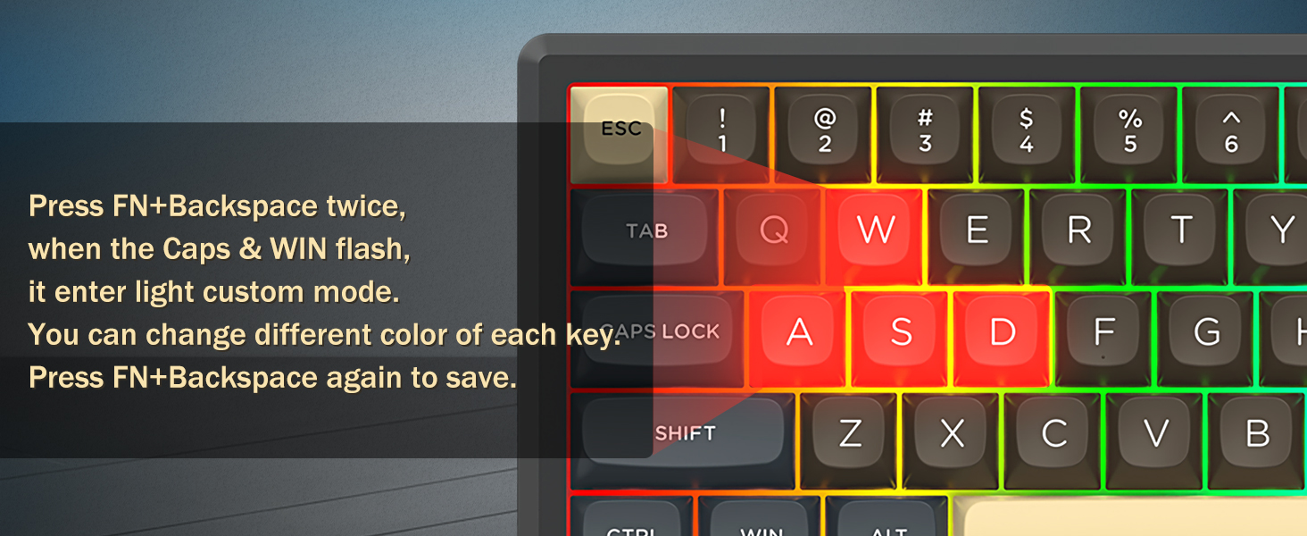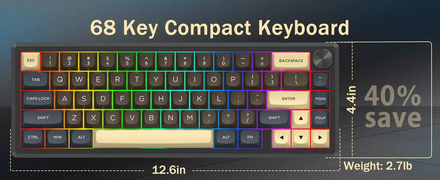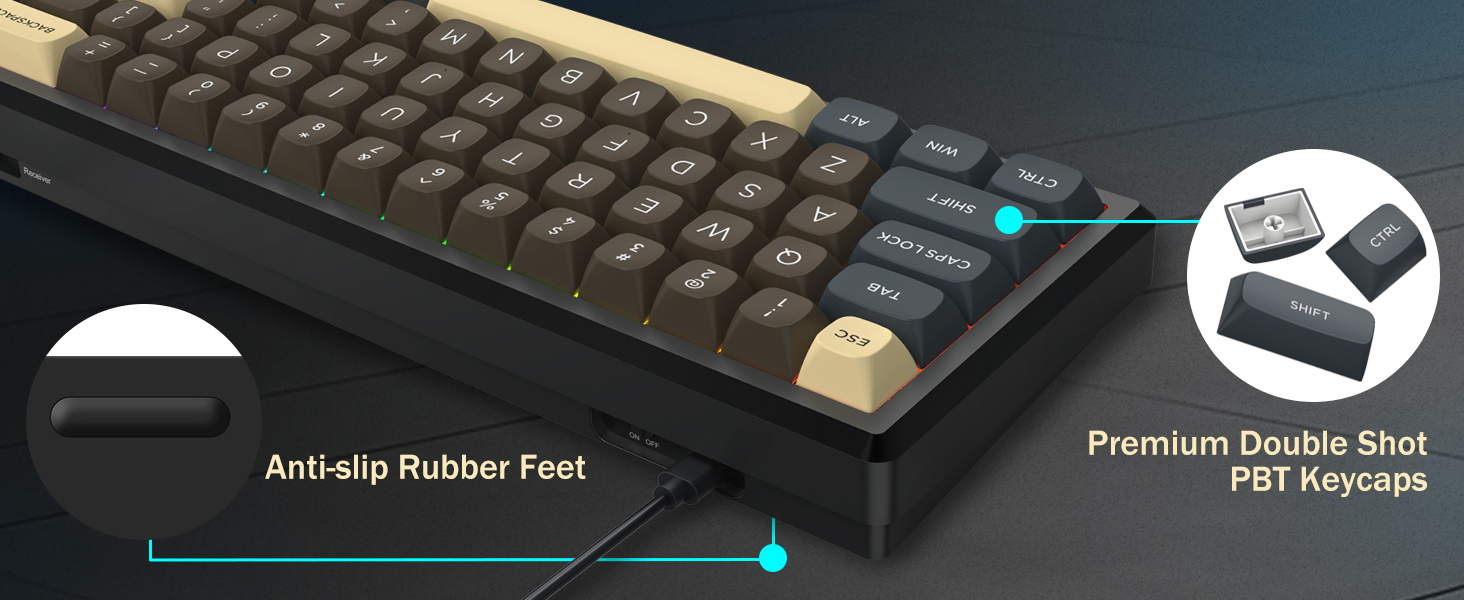 Энэхүү гар нь 60%-ийн зохион байгуулалттай тул чухал биш товчлууруудыг устгаж, товчлуурын хослолоор дамжуулан үндсэн функцийг хадгалдаг. Энэхүү загвар нь ширээний эмх замбараагүй байдлыг багасгахад тусалдаг ба хулгана хөдөлгөөнд илүү зай гаргаж, тоглоом тоглох болон бүтээмжийн орчинд тохиромжтой.