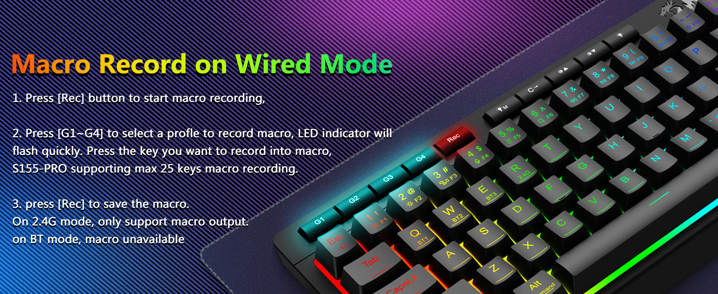 Тохируулах боломжтой MacROS, зориулагдсан Backlit хяналт- Progry 4-р самбар дээрх MACRO товчлуурууд (G1-G4) Шууд шаардлагагүй. Тоглоомын цогц комосыг тэмдэглэх, бүтээмж, медиа командын товчлолуудыг тэмдэглэ. Ажлынхаа урсгалыг хэдхэн секундын дотор дахин тодорхойл. Та PROPINES функцийг тохируулахын тулд програмыг ашиглаж, MacROS үүсгэхийн тулд програм хангамжийг ашиглаж болно. 26 товчлуурын эсрэг товчлууруудыг (доогуур зураастай товчлуурын товчлуурууд) таны хүссэнээр хурдан, үнэн зөв, үнэн зөв тоглолтын дагуу ажиллана. Гэрэлт, гэрэлтүүлэг горим, гэрэлтүүлгийн горим, тоглоомын горимыг хурдан тохируулах, гэрэлтүүлэх горимыг хурдан тохируулах, тоглоомын горимыг хурдан тохируулах, тоглоомын горимыг хурдан тохируулах, тоглоомын горимыг товчлуур дээр дарж, товчлуурын горимыг идэвхжүүлнэ үү.