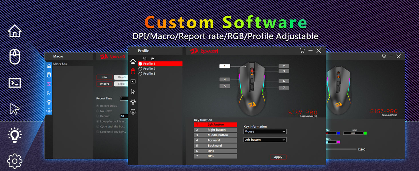 Хамгийн ихдээ 12800 DPI тохируулж болно- Таны хулганы хөдөлгөөнийг товшиж, таны хулганы хөдөлгөөнийг товшиж тэмдэглэхэд хүргэдэг 5-р төвүүдтэй. 5 DPI түвшин нь програм хангамжаар дамжуулан DIY-тэй үнэгүй, тоглоомчдыг тоглоомонд хурдан шилжүүлэхийг идэвхжүүлээрэй.